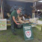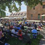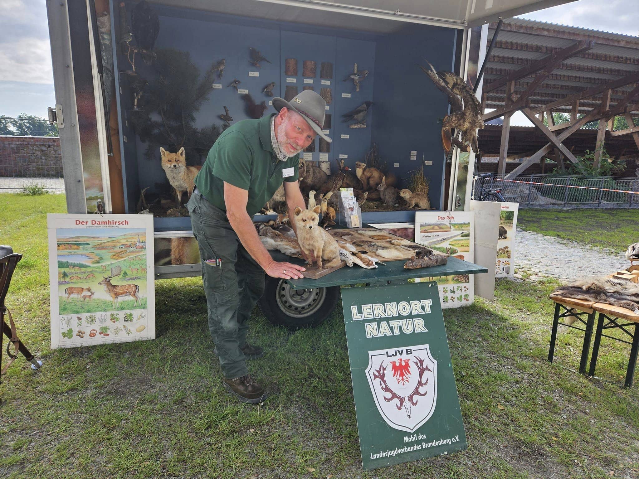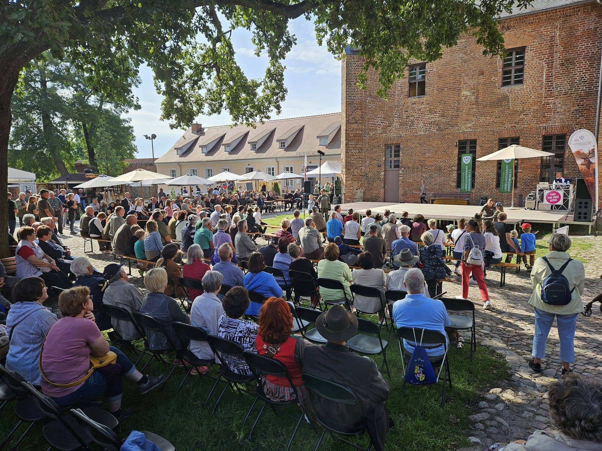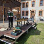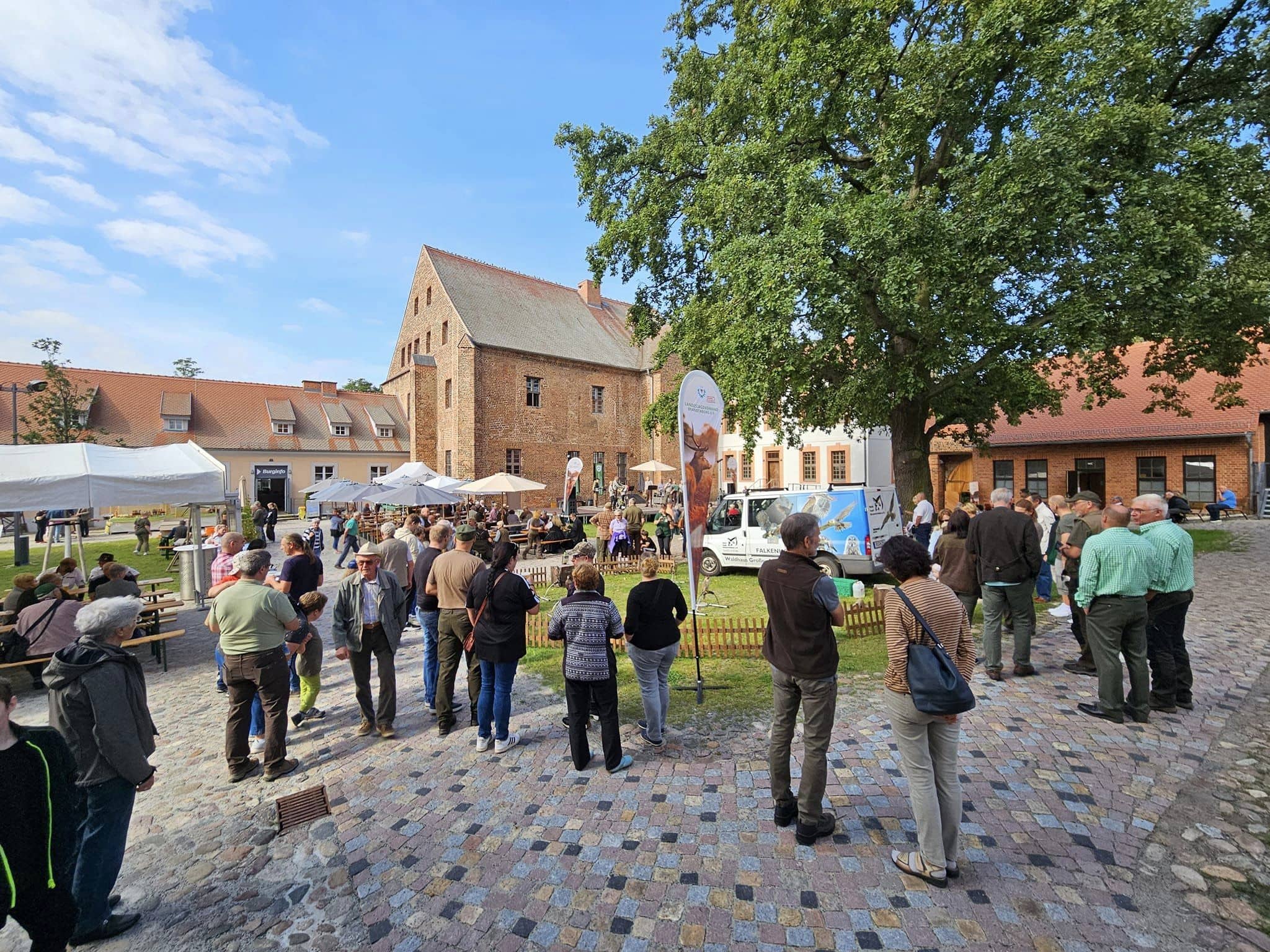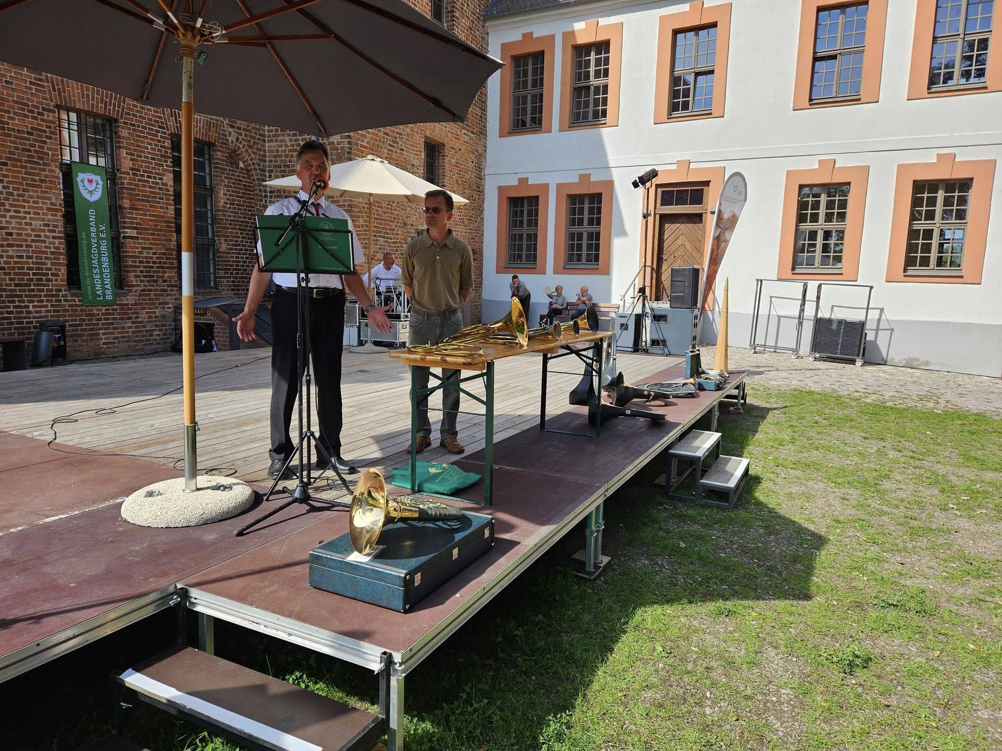 Neben erstklassigen Auftritten der einzelnen Jagdhornbläsergruppen fand auch eine Greifvogelvorführung des Wald-Jagd-Naturerlebnis e.V. unter der Leitung von Ilka Simm-Schönholz statt, die für Begeisterung bei den Besucherinnen und Besuchern sorgte. Jagdhundeführer und Züchter Jan Dollwetzel hatte über 20 Jagdgebrauchshunde organisiert und stellte mit viel Fachwissen und Humor die einzelnen Jagdhunderassen und ihre Einsatzgebiete vor. Im altehrwürdigen Gemäuer der Burg Beeskow durfte selbstverständlich auch ein geschichtlicher Exkurs zum Jagdhorn nicht fehlen. Der Leiter der Jagdhornbläsergruppe Hubertusstock, Lutz Hamann und Instrumentenbaumeister Christian Dobberstein hatten über 15 Instrumente mitgebracht, um die Entwicklung, die unterschiedliche Ausprägung und die Geschichte des Jagdhorns anschaulich darzustellen.